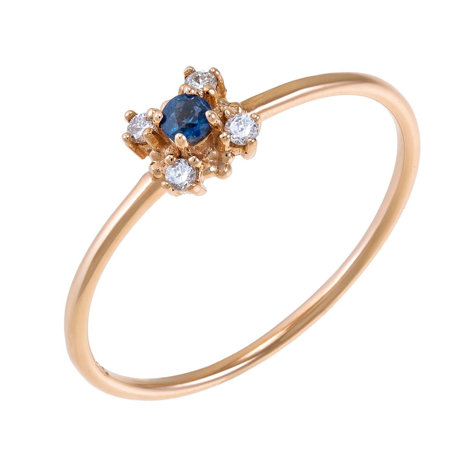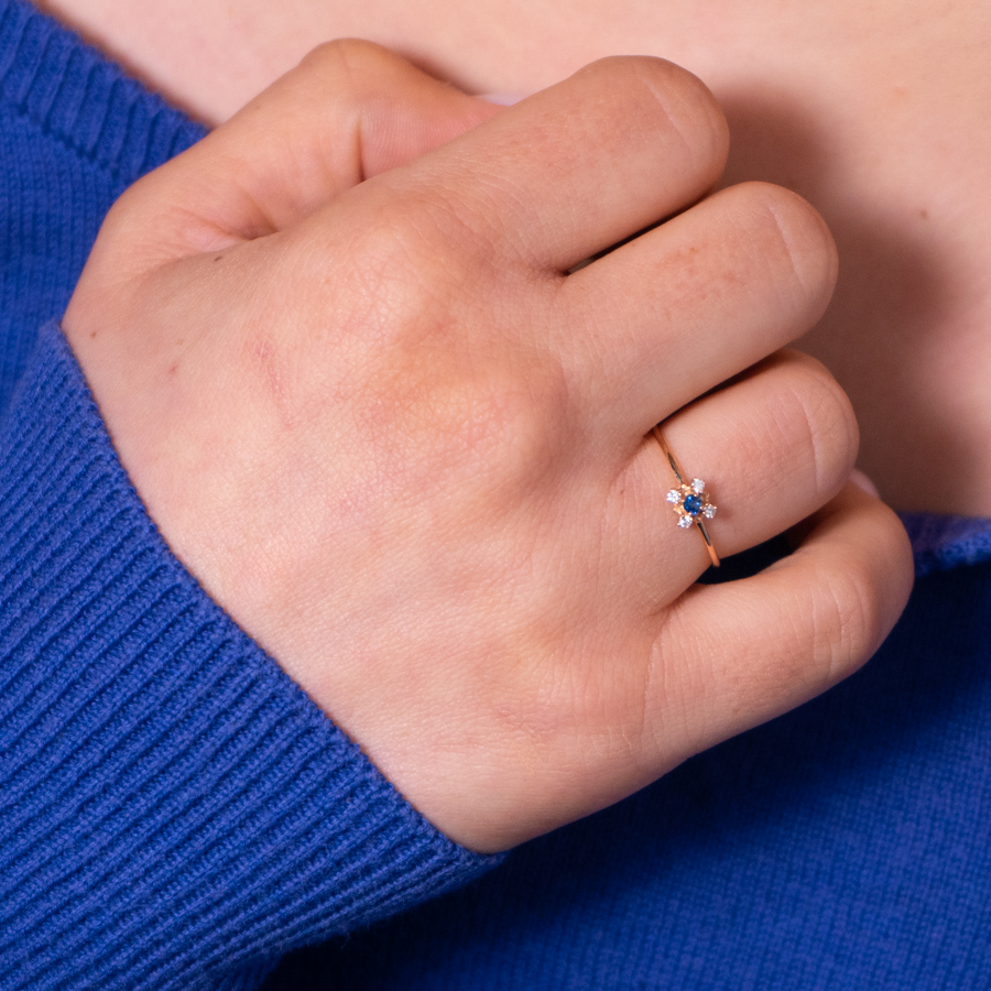 Δαχτυλίδι από κόκκινο χρυσό 18 καρατίων με ζαφείρι 0.06ct και λευκά διαμάντια 0.04ct συνολικά τοποθετημένα στο καστόνι.