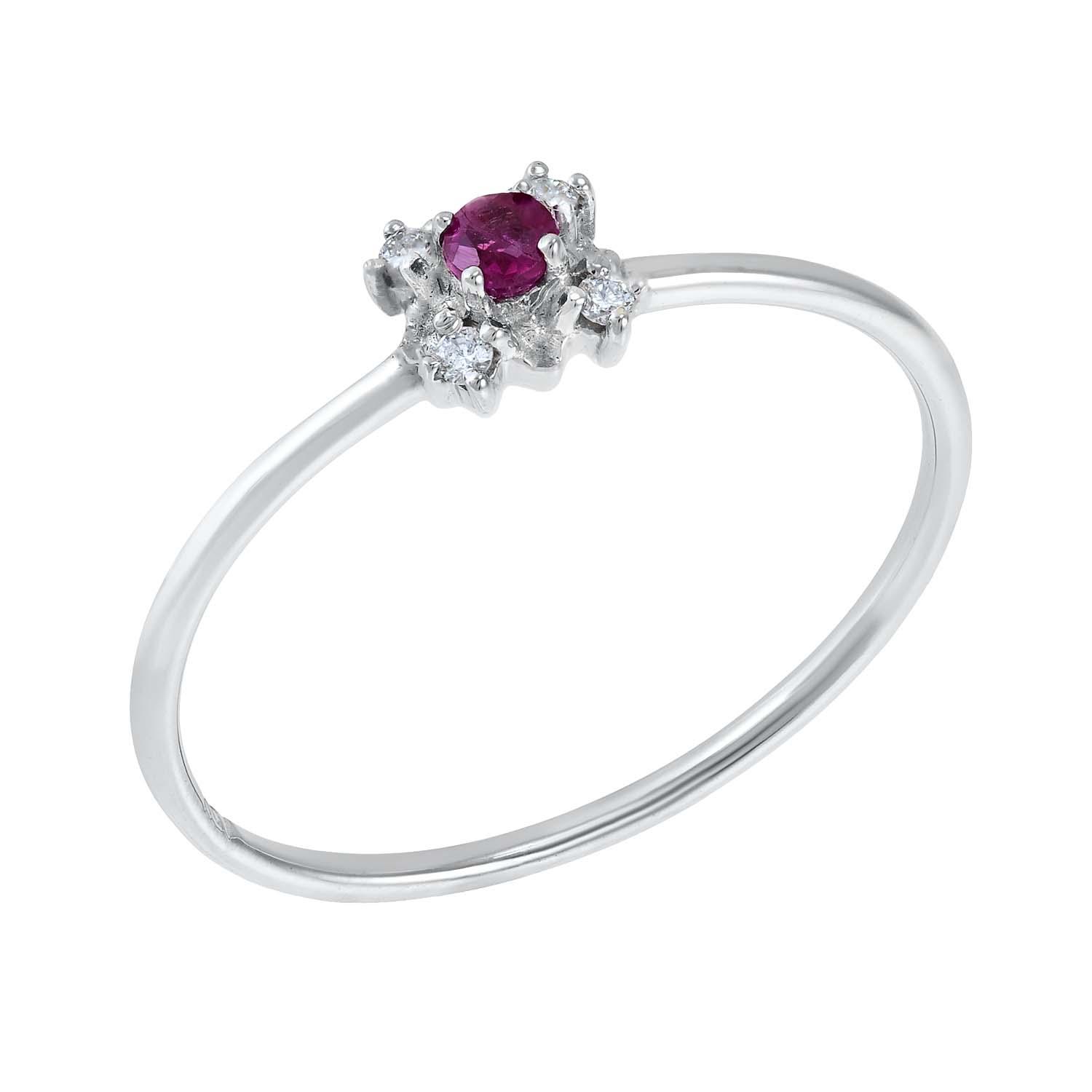 Δαχτυλίδι από λευκό χρυσό 18 καρατίων με ρουμπίνι 0..09ct και λευκά διαμάντια 0.04ct συνολικά τοποθετημένα στο καστόνι.