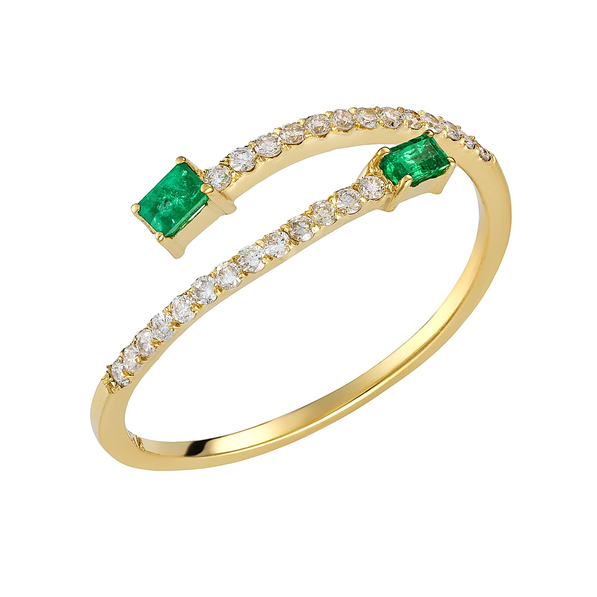 Δαχτυλίδι από κίτρινο χρυσό 18 καρατίων με σμαράγδια και λευκά διαμάντια συνολικά τοποθετημένα κατά μήκος της γάμπας.