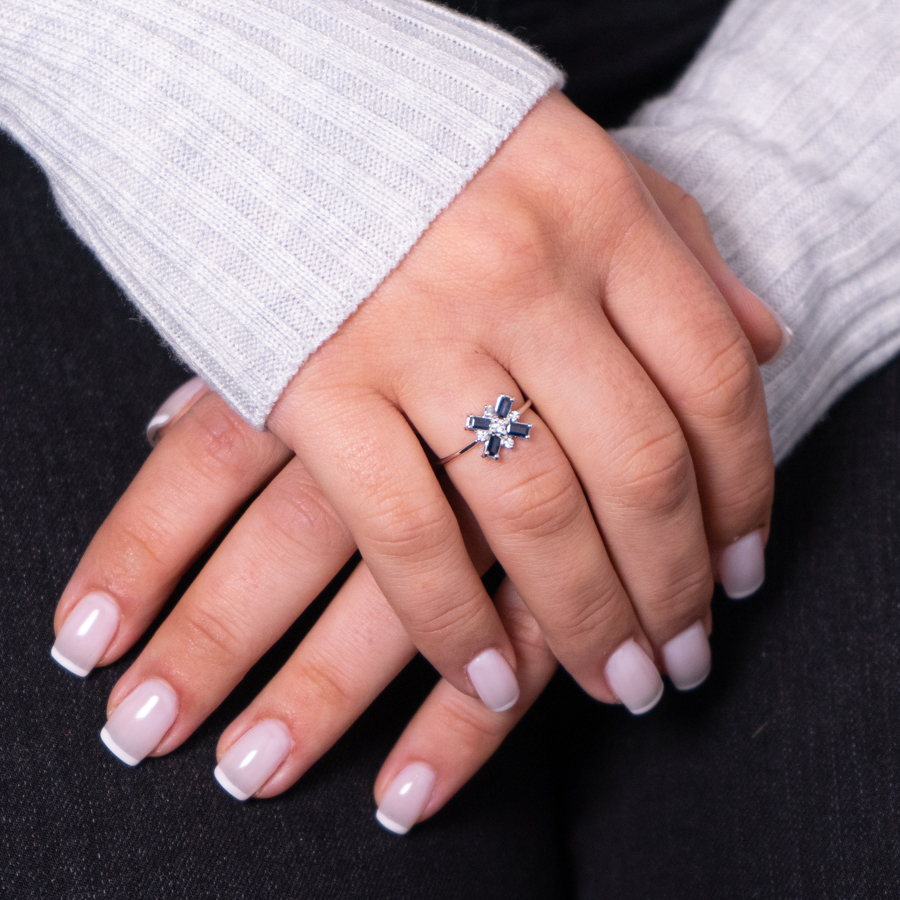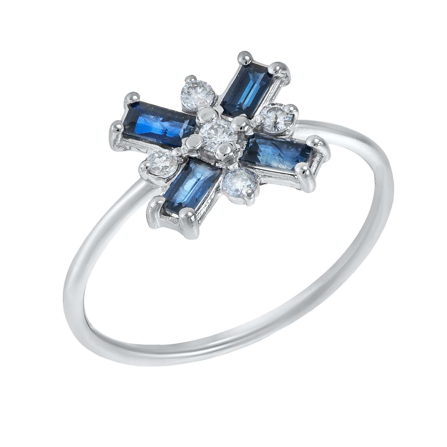 Δαχτυλίδι από λευκό χρυσό 18 καρατίων με ζαφείρια 0.47ct και λευκά διαμάντια 0.10ct συνολικά τοποθετημένα στο καστόνι και κατά μήκος της γάμπας.