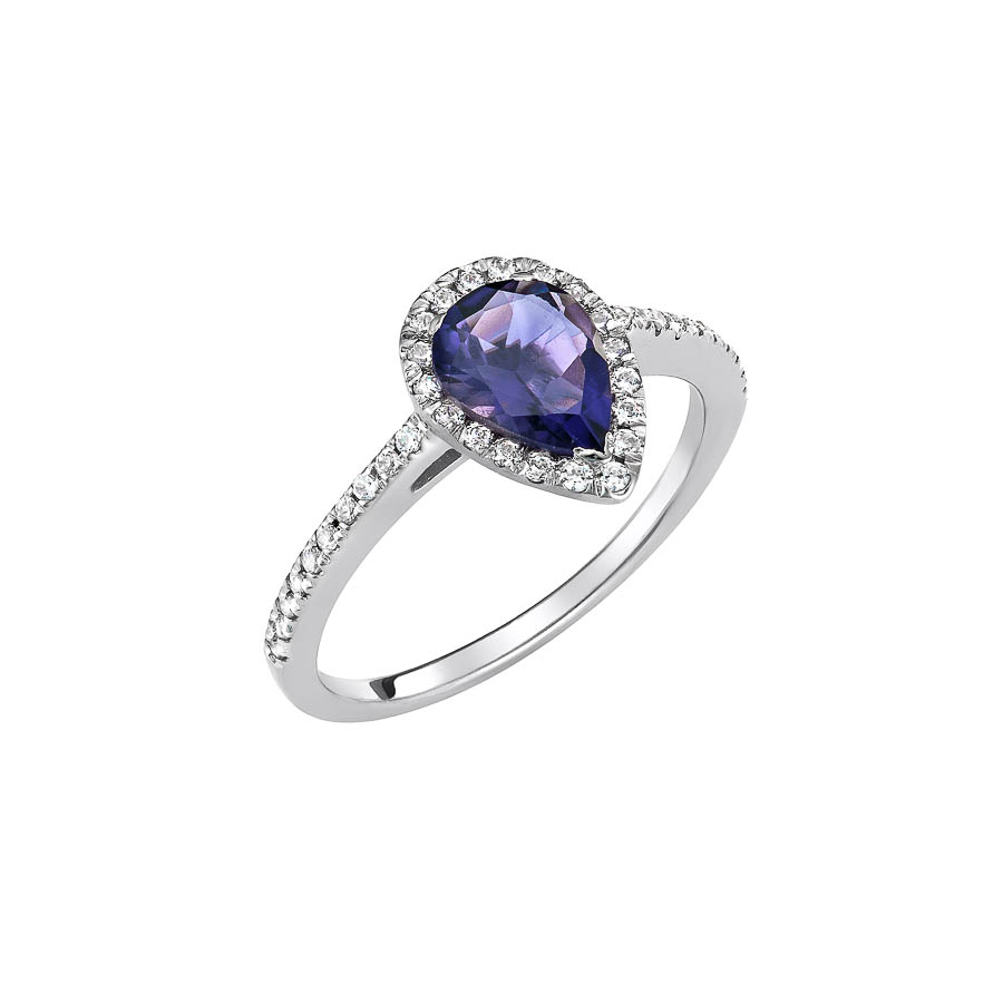 Δαχτυλίδι από λευκό χρυσό 14 καρατίων με μπλε και λευκά ζιργκόν συνολικά τοποθετημένα κατά μήκος της γάμπας.