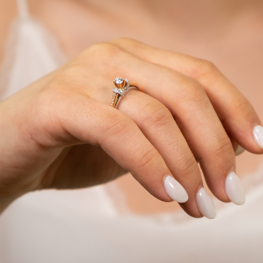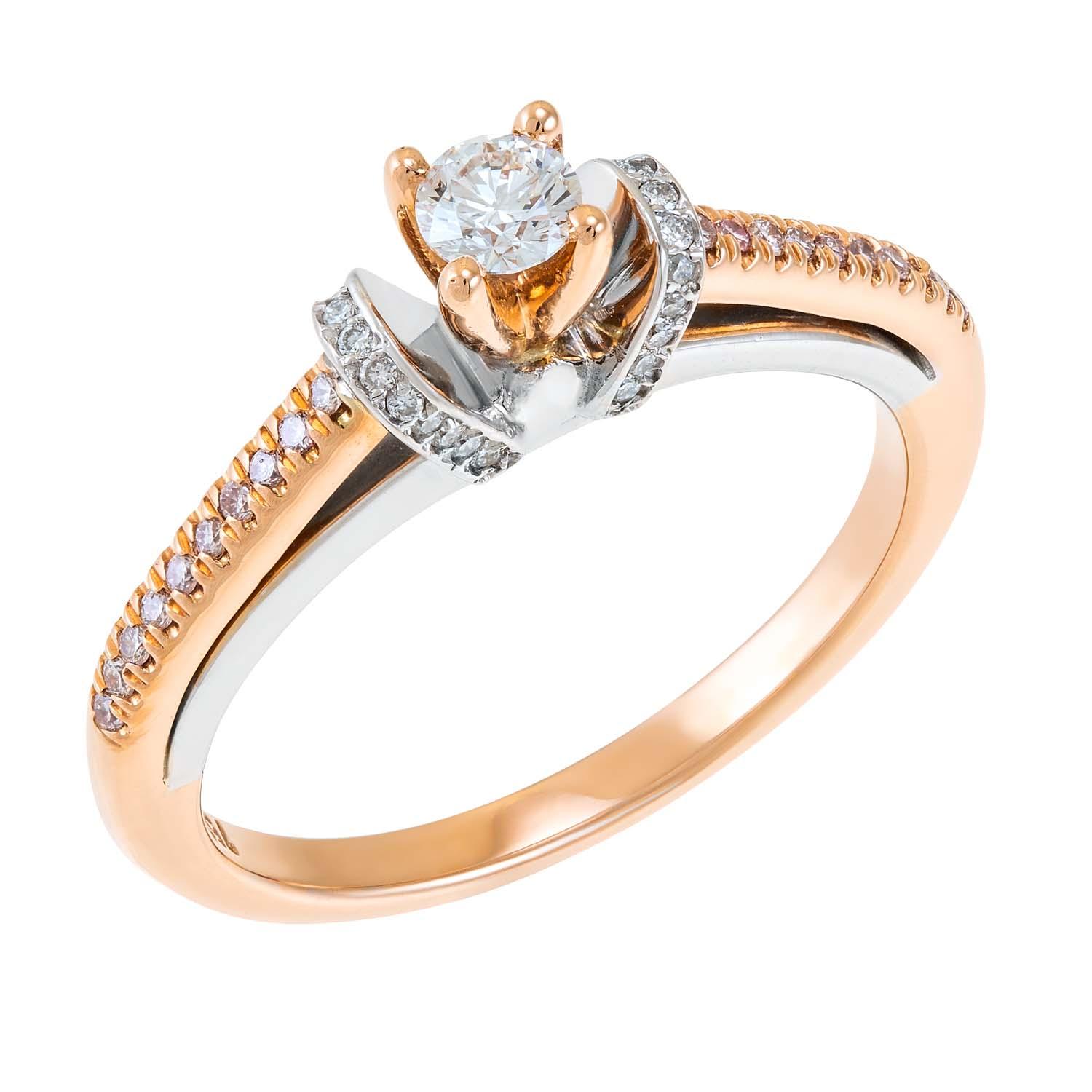 Δαχτυλίδι από λευκό και κόκκινο χρυσό 18 καρατίων με λευκό διαμάντι 0.17ct και διαμάντια 0.16ct συνολικά τοποθετημένα κατά μήκος της γάμπας.