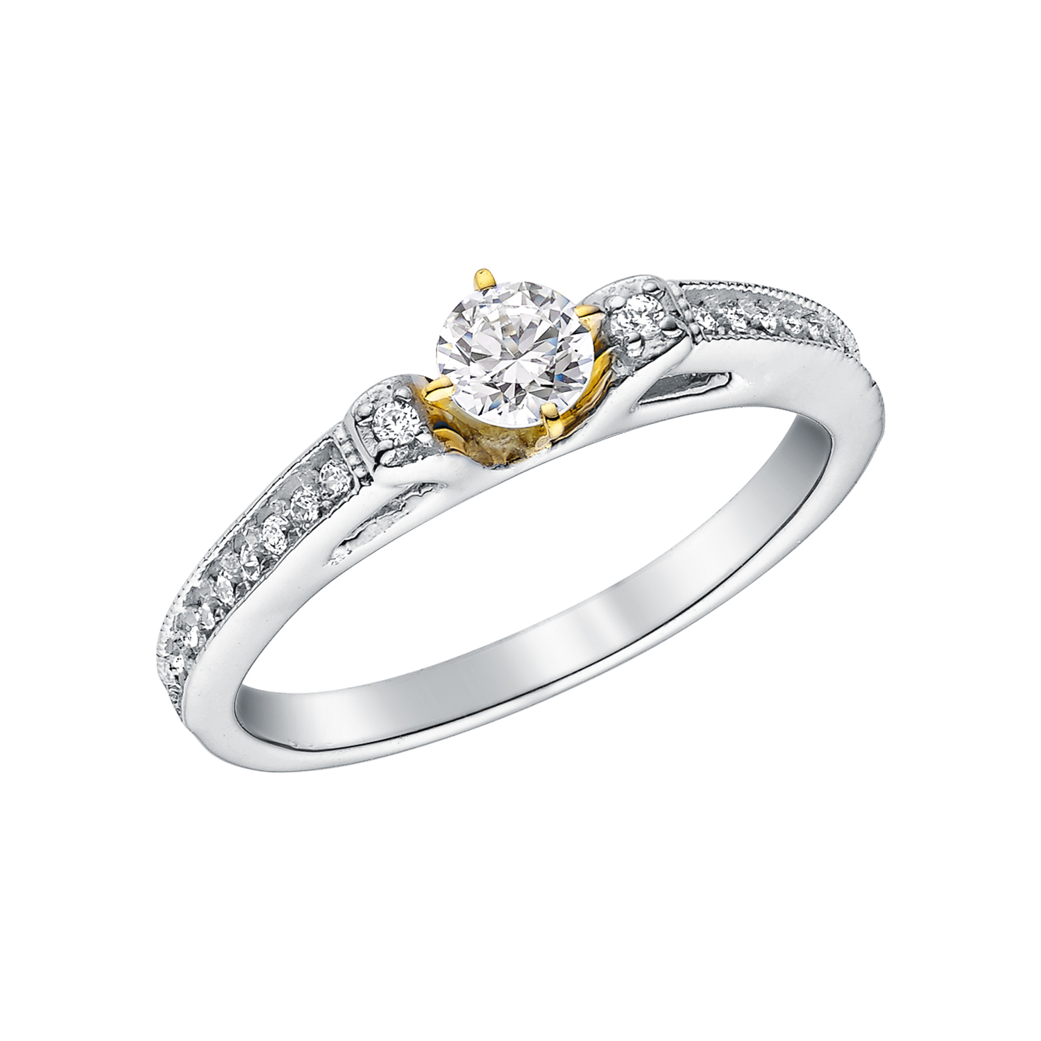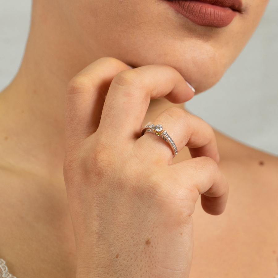 Δαχτυλίδι από λευκό και κίτρινο χρυσό 14 καρατίων με λευκό ζιργκόν τοποθετημένο στο καστόνι .