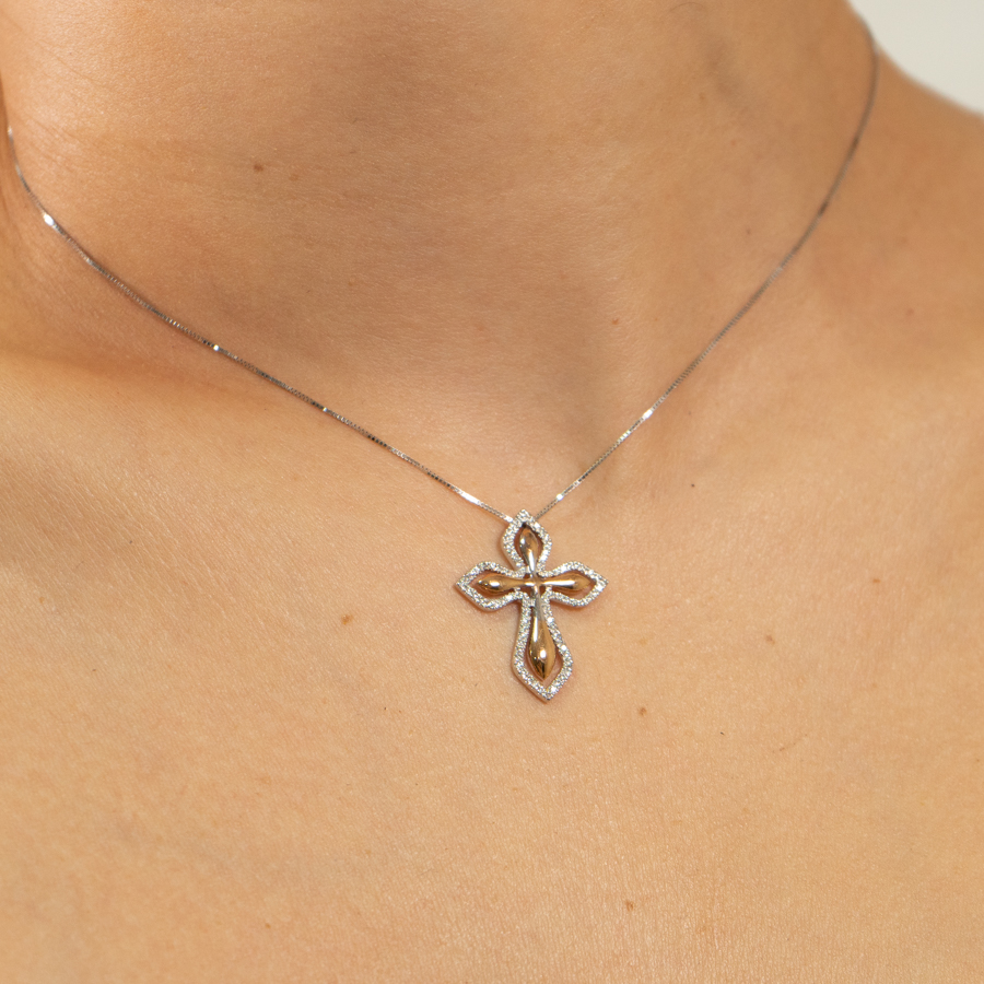 18ct white and red gold cross with white diamonds along its length.