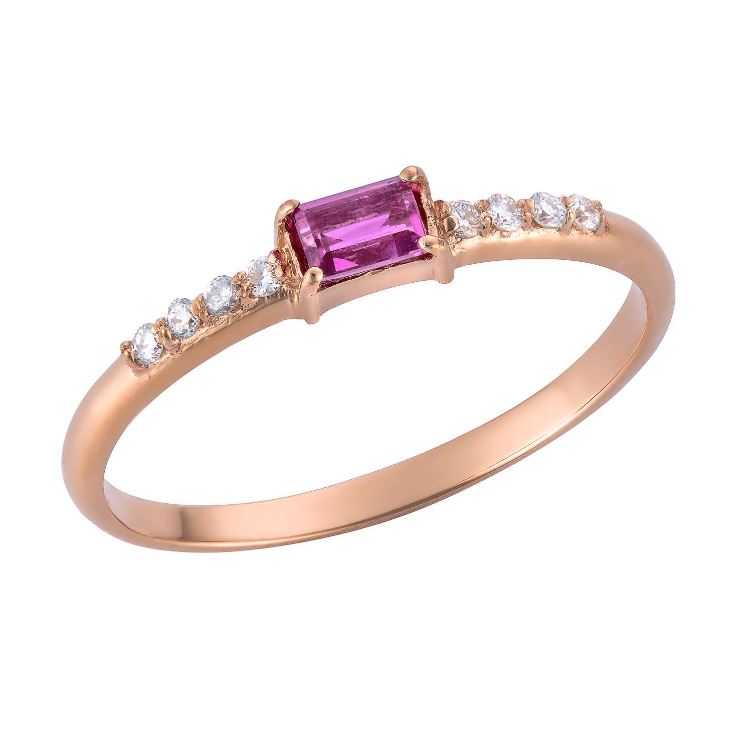 18ct red gold ring with a 0.15ct ruby and 0.03ct white diamonds fitted on the bezel and along the shank.