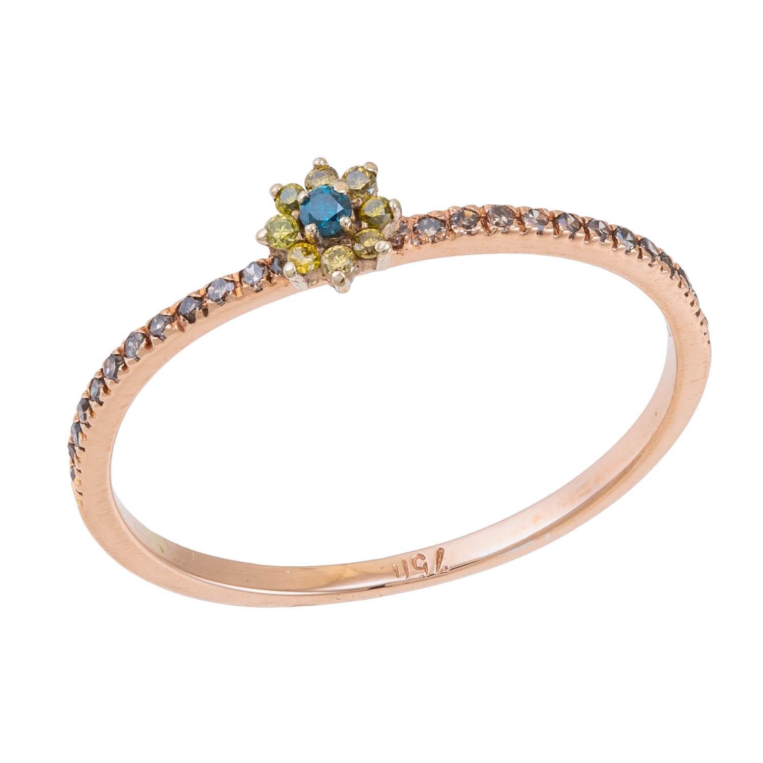 18ct red gold ring with 0.10ct brown diamonds, 0.03ct yellow diamonds and a 0.01ct blue diamond fitted on the bezel and along the shank.